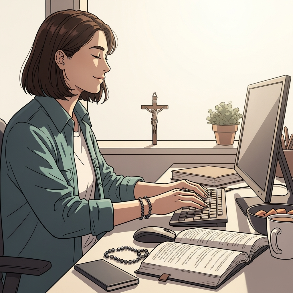 No trabalho sempre agir com honestidade, justiça e respeitando o ambiente proffisional. Ofereça seu trabalho a Deus, transforme suas tarefas diárias em uma oração, pedindo orientação e oferecendo suas ações como um ato de louvor. Partilhe valores cristãos, seja um exemplo de paciência, generosidade e compreensão no trato com colegas e clientes.